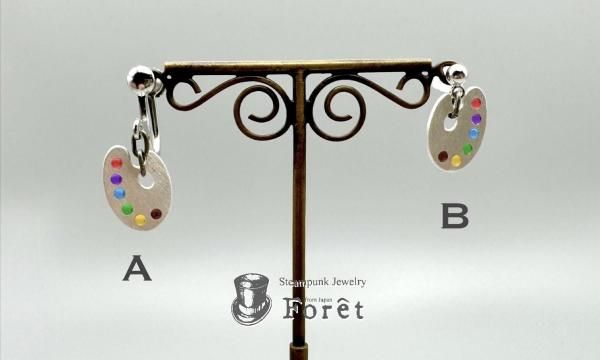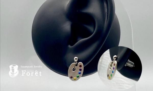 樹脂で絵具を表現したパレットモチーフのピアス、イヤリングのシルバーバージョンになります。