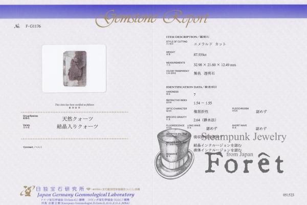 ガーデンクォーツ 37.559ctのネジ留めのペンダントトップになります。【鑑別書付】 透き通る綺麗な結晶入りクォーツです。 四隅を上から螺子で固定する留め方の個性的なペンダントトップです。 【素材】 真鍮、結晶入りクォーツ 37.559ct 【大きさ】 約高40×幅41×厚16mm 【付属品】 ・約60cm小判チェーン(丹銅にメッキ) ・鑑別書 【注意事項等】 ※お使いのモニターの設定状況により、実際のカラーの色味と異なる場合があります。 ※衝撃等でワイヤーが曲がることがあります。ぶつけたり、落としたり等お気をつけください。 ※ネジは回して石を外す事も可能な仕様になっております。締め過ぎると石を欠いてしまいますので、外して戻す場合はご注意下さい。 普段のお取り扱いは【真鍮製品のお取り扱いについて】【素材のお取り扱いについて】をよくお読みいただいた上で、お楽しみ頂いけますようお願い申しあげます。